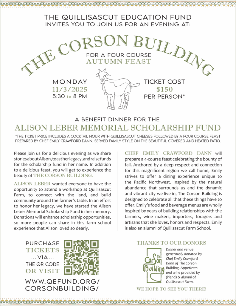 Dinner and venue is generously provided by Emily at The Corson Building, appetizers, drinks and wine provided by friends of Quillisascut Farm. Your ticket purchase is a donation to the Quillisascut Education Fund, which offers financial support to make workshops at Quillisascut accessible to all. THANK YOU FOR YOUR SUPPORT!